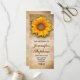 Fun, rustic country wedding programs with beautiful sunflower blossom on the old barn wood background.