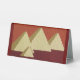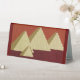 Image printed on table tent is from a photo of an original tapestry crochet wall hanging designed handmade and Copyright © by published designer Delores Chamblin. The picture of the unique handcrafted creation with Egyptian pyramids geometric shapes in natural warm earth tone colours is reproduced on the stand alone tent.