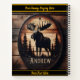 A stunning wood carving of a moose majestically poses against a backdrop of trees, showcasing nature's beauty and craftsmanship.