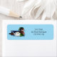 A wood duck in the water with a white water lily beside the duck in a backdrop of blue