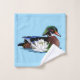 A wood duck in the water with a white water lily beside the duck in abandoned backdrop of blue