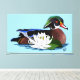 A wood duck int he water with a white water lily beside the duck in a backdrop of blue