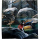 Two wood ducks in a pond in a forest, Trees and rocks all around the pond while the male and female wood ducks enjoy the pond