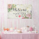 Wedding Shower Celebration Welcome Sign Banner Templates - Vintage Watercolor Pink Flowers and Elegant String Lights on Rustic Light White Wash Soft Wood Texture Background.