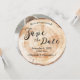 For your rustic wedding theme, discover the perfect Save the Date card featuring charming printed wood grain elements. This round card design mimics the rustic beauty of a wood disc slice often found at romantic weddings. Personalise it with the names of the bride and groom, wedding date, and location. You can also include your wedding website and a photo to make it truly unique. If a wedding website isn't applicable, feel free to exclude it. Create a memorable impression with this exquisite rustic Save the Date card."