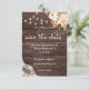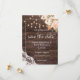 Send a save the date card to get your guests ready to celebrate your wedding or party with this wood, lace, and string lights, and blush pink & peach floral rustic or country floral save the date card.