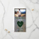Rustic wood wedding monogrammed photo Save the Date announcements- Personalised couple photo at top. Rustic, green buffalo plaid heart has monogrammed initials of the bride and groom. Reads Save the Date below photo in elegant green script with shadow effect and wedding date. Personalised bride and groom names at bottom with drop shadow, in matching green lettering. With rustic wood photo background of scarred, distressed woodgrain. Fits rustic weddings, barn weddings, boho wedding themes, and woodland forest weddings. Perfect for rustic bridal shower or country western wedding anniversary party as well.