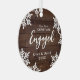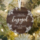 Personalised first Christmas engaged ornaments feature elegant trendy script and snowflakes on rustic wood background, optional couple photo on the back, modern and simple.