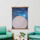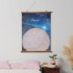 This depicts a picture of the moon being held at the tips of one's fingers. A shooting star flies across the midnight blue sky with shimmering stars lighting up the night. A very light outline of clouds rises up in the background.