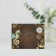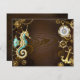 Brown wooden background with sea, mechanical ridge, an antique steering wheel, golden anchor and various gold and brass gears. Steampunk style.