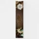 Brown wooden background with sea, mechanical ridge, an antique steering wheel, golden anchor and various gold and brass gears. Steampunk style.