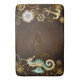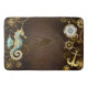 Brown wooden background with sea, mechanical ridge, an antique steering wheel, golden anchor and various gold and brass gears. Steampunk style.