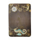 Brown wooden background with sea, mechanical ridge, an antique steering wheel, golden anchor and various gold and brass gears. Steampunk style.