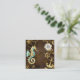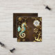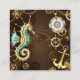 Brown wooden background with sea, mechanical ridge, an antique steering wheel, golden anchor and various gold and brass gears. Steampunk style.