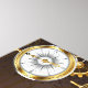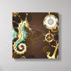 Brown wooden background with sea, mechanical ridge, an antique steering wheel, golden anchor and various gold and brass gears. Steampunk style.