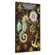 Brown wooden background with sea, mechanical ridge, an antique steering wheel, golden anchor and various gold and brass gears. Steampunk style.