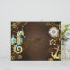 Brown wooden background with sea, mechanical ridge, an antique steering wheel, golden anchor and various gold and brass gears. Steampunk style.