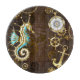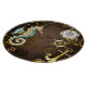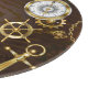 Brown wooden background with sea, mechanical ridge, an antique steering wheel, golden anchor and various gold and brass gears. Steampunk style.