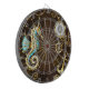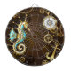 Brown wooden background with sea, mechanical ridge, an antique steering wheel, golden anchor and various gold and brass gears. Steampunk style.