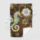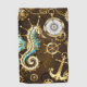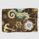 Brown wooden background with sea, mechanical ridge, an antique steering wheel, golden anchor and various gold and brass gears. Steampunk style.