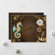 Brown wooden background with sea, mechanical ridge, an antique steering wheel, golden anchor and various gold and brass gears. Steampunk style.