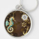 Brown wooden background with sea, mechanical ridge, an antique steering wheel, golden anchor and various gold and brass gears. Steampunk style.