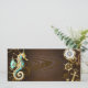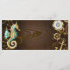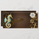 Brown wooden background with sea, mechanical ridge, an antique steering wheel, golden anchor and various gold and brass gears. Steampunk style.