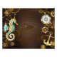 Brown wooden background with sea, mechanical ridge, an antique steering wheel, golden anchor and various gold and brass gears. Steampunk style.
