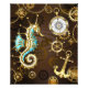 Brown wooden background with sea, mechanical ridge, an antique steering wheel, golden anchor and various gold and brass gears. Steampunk style.