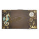 Brown wooden background with sea, mechanical ridge, an antique steering wheel, golden anchor and various gold and brass gears. Steampunk style.