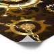 Brown wooden background with sea, mechanical ridge, an antique steering wheel, golden anchor and various gold and brass gears. Steampunk style.