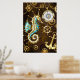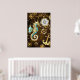 Brown wooden background with sea, mechanical ridge, an antique steering wheel, golden anchor and various gold and brass gears. Steampunk style.