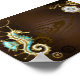 Brown wooden background with sea, mechanical ridge, an antique steering wheel, golden anchor and various gold and brass gears. Steampunk style.