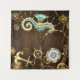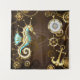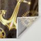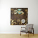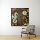 Brown wooden background with sea, mechanical ridge, an antique steering wheel, golden anchor and various gold and brass gears. Steampunk style.