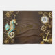Brown wooden background with sea, mechanical ridge, an antique steering wheel, golden anchor and various gold and brass gears. Steampunk style.