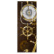 Brown wooden background with sea, mechanical ridge, an antique steering wheel, golden anchor and various gold and brass gears. Steampunk style.