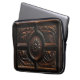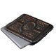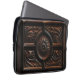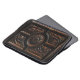This laptop sleeve is decorated with a flat image of a beautiful artistic wood carving in shades of brown, gold, mahogany and black. A central abstract circular flower image has petals radiating out to a carved circle which is surrounded by four sections. Each section has abstract leaf carvings. The image is so realistic it seems three dimensional.
