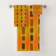 This towel set has a mid-century modern design of rectangles and circles connected in wall hangings.