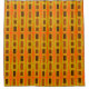 This shower curtain has a mid-century modern design of rectangles and circles connected in wall hangings.