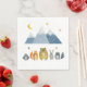 These party napkins take you on a captivating journey into the heart of the wilderness with a mesmerising mountain scene at night, featuring the moon and stars, along with delightful illustrations of a rabbit, racoon, bear, owl, and fox, all in a harmonious colour palette of grey, navy blue, copper, and brown.