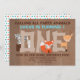 This boy's woodland animals birthday party invitation features four cute animals, a fox, rabbit and deer. The design also features a large word in a wood-like font. The background is a wood image. I've included a random polka dot pattern on the back of the invitation in turquoise and orange. This design is also available with a photograph. This boy's woodland animals 1st birthday party invitation is ready to be personalised.