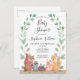 These forest friends, fox, racoon, hedgehog, bunny, and squirrel are surrounded by rustic greenery.