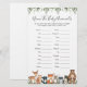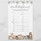 Woodland animals themed baby shower name the baby animals game card features a watercolor woodland animals illustration and watercolor greenery eucalyptus garland and elegant handwritten style font.