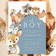 This baby shower invitation features a variety of woodland animals framing a modern arch in blue, making it perfect for a boys baby shower. The deer, bunny, fox, beaver, wolf, owl, and racoon add a touch of whimsy and fun, while the elegant arch design keeps the invitation looking polished and sophisticated.