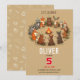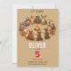 This charming kids’ birthday party invitation features adorable woodland animals — including fox, racoon, bear, deer, and owl — sitting around a cosy campfire wearing party hats. Perfect for outdoor, nature, or camping-themed celebrations.