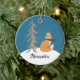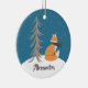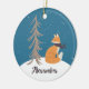 Super cute Christmas ornament with a woodland animal theme. Design features a dark blue sky with white snow falling over a snow covered hill. Atop the hill is a whimsical pine tree in a muted neutral colour with an adorable fox sitting next to it. The woodland fox is wearing a dark brown Winter scarf. Below the fox and Christmas pine tree is customisable text in brown font where you can add a name to personalise. The design and name appear on both sides of the Christmas ornament.