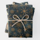 3 sheets of Beautiful Christmas Wrapping paper on a Teal Blue background. Each sheet has a different pattern or illustration. Beautifully crafted stars and flowers, Woodland forest and bear, Woodland animals – a fox and a squirrel sharing a place with a snowman. Have fun wrapping your presents with this whimsical woodland paper sheets.