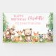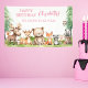 Woodland Animals Girl Birthday Banner! Cute woodland animals theme adorns this birthday banner. Personalise this birthday banner that features illustrations of a possum, doe, bear, fox, racoon, mouse, and owl in forest scene. Fun and playful woodland animals complement this personalised birthday banner.