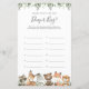Woodland animals themed baby shower guess what's in the diaper bag game card features a watercolor woodland animals illustration and watercolor greenery eucalyptus garland and elegant handwritten style font.