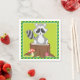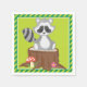 This design features a grey, black and white racoon sitting on a tree stump next to red and white mushrooms. The background is a grassy green square bordered by diagonal stripes in two shades of green.